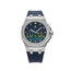 This Royal Oak Offshore Music Edition is crafted in a titanium case measuring 37mm in diameter. The aesthetic of this watch is inspired by music with its dial representing a VU meter and its push-piece guards evoking mixer faders. A blue textured interchangeable rubber strap – a first for the smaller wrists – complements the overall design. This timepiece is pre-owned, but it is in excellent condition and comes with its original box and papers. Despite being pre-owned, this watch is in excellent condition and comes complete with its original box and paper