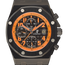 Preowned-26170ST.OO.D101CR.01 Audemars Piguet. This watch comes with 42 mm stainless steel with DLC coating case.The fixed octagonal stainless steel with DLC coating bezel is attached to the case and case back with 8 through screws.The black dial is decorated with the "Mega Tapisserie" motif and black three sub-dial. Luminescent orange-tone hour hands and orange-tone applied luminous Arabic numerals. Orange Inner bezel with tachymeter scale.The date window is located at the 3 o'clock position. This watch has three subdials at 6, 9 and 12 o’clock position. 30-minute sub-dial are located at the 9 o’clock position.12-hour counter is located at 6 o’clock position. 60 seconds sub-dial at 12 o'clock. The watch performs following functions: hours, minute, second, date, chronograph. Self-winding mechanical movement is powered by a ?alibre AP 3126/3840. Power reserve approximately 40 hours. Case Thickness - 14.2 mm. Case back is solid. Sapphire crystal protects front side of the watch. Black alligator leather strap with folding clasp buckle. This model is water-resistant up to 100 m.