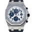 Preowned-26020ST.OO.D020IN.01 Audemars Piguet. This watch has a brushed stainless steel case measuring 44 x 47.5 mm with a bezel secured with 8 screws. The white dial has a Mega-Tapestry "waffle" design texture and large Arabic numeral hour markers. It has blue hands with a luminous coating and a date window at 3 o'clock. The watch has three sub-dials for chronograph functions (60 seconds at 12 o'clock, 30-minute at 9 o'clock, and 12-hour counter at 6 o'clock), as well as a tachymeter scale on the inner bezel flange ring. The watch performs functions including hours, minutes, seconds, date, chronograph, and tachymeter. It is powered by a self-winding mechanical movement (?alibre 2326/2840) with a power reserve of approximately 40 hours. The case has a thickness of 14.8mm and a solid case back. The front side of the watch is protected by a sapphire crystal. The watch is completed with a black leaher strap and a folding clasp and is water-resistant up to 100 meters.