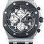 Preowned-25940SK.OO.D002CA.03 Audemars Piguet This watch comes with 42 mm Stainless steel case. Fixed Stainless steel & black rubber bezel is secured with 8 titanium H-shaped screws. Black dial with signature 'Méga Tapisserie' treatment. Black inner bezel with tachymeter scale. White luminous Roman numerals. White luminous hour hands. Central second hand. The date window is located at the 3 o'clock position. This watch has three sub-dials chronograph : 60 seconds sub-dial at 12 o'clock, 30-minute sub-dial at 9 o'clock, 12-hour counter at 6 o'clock. The watch performs following functions: hours, minutes,seconds,date, chronograph. Self-winding mechanical movement is powered by a ?alibre AP 2326/2840. Power reserve approximately 40 hours. Case Thickness - 14,5 mm. Case back is solid. Sapphire crystal protects front side of the watch. Black rubber strap with folding clasp buckle. This model is water-resistant up to 100 m.