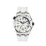 The Royal Oak Offshore Diver in a sleek white edition features a robust 42mm stainless steel case with a 300m water resistance, making it ideal for underwater exploration. The white dial, adorned with a "Méga Tapisserie" pattern, showcases white gold hour-markers and Royal Oak hands. The rhodium-plated hands and black rubber-clad screw-locked crowns add sophistication, while the rotating inner bezel aids diving functionality. Powered by an automatic movement, this watch is in great pre-owned condition and includes an extra rubber strap, original box, and papers. A perfect blend of style and functionality.