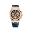 This 18-carat pink gold Royal Oak Selfwinding Chronograph adorns a blue "Grande Tapisserie" dial with pink gold-toned counters, pink gold applied hour-markers and Royal Oak hands with luminescent coating. This brand new model features a 41mm 18-carat pink gold case, glareproofed sapphire crystal and caseback, and screw-locked crown. This classical timepiece comes on a hand-stitched, large square scale, blue alligator strap with an 18-carat pink gold AP folding clasp.