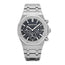 This Royal Oak Selfwinding Chronograph is crafted in a stainless steel case measuring 41mm in diameter. The black dial features the 'Grand Tapisserie' pattern, black counters, white gold applied hour-markers and Royal Oak hands with luminescent coating. The watch comes on a stainless steel bracelet with AP folding clasp.