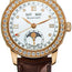 Discover unparalleled sophistication with the Preowned-2360-2991A-55 Blancpain, a masterpiece of haute horology. This watch has a 34mm 18K Rose Gold case. Fixed 18 Rose Gold bezel set with diamonds. White Mother of Pearl dial set with 6 Diamond Hour Markers & with Applied Roman Numerals. Day & Month Windows displayed beneath the 12 o'clock position. Date shown using the 3rd hand with the Arrow end pointing to the date on the outer rim of the dial. Moonphase sub-dial & small seconds hand located at the 6 o'clock position. Blancpain Caliber 6763, composed of 262 components & 30 Jewels. Aprox. Power Reserve of 100 hours. Brown alligator leather strap with tang buckle. Click Order Now to place your order or call us to discuss this stunning timepiece in more detail.