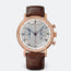 Classique chronograph in 18-carat rose gold. Hand-wound movement with double seconds and 30-minute totalizer. Tachometric scale surrounding the chapter ring. Silvered gold dial, hand-engraved on a rose engine. Sapphire case back. Water-resistant to 3 bar ( 30 m ). Diameter : 42.5 mm. Also in white gold. Available with black rhodium-plated gold dial.