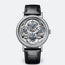 Case in platinum with a finely fluted case band. Sapphire case back. 41 mm diameter. Welded lugs with screw bars. Water-resistant to 3 bar (30m). Skeleton dial in silvered 18-carat gold. Individually numbered and signed BREGUET. Hours chapter with Roman numerals on a sapphire disc. Breguet open-tipped hands in blued steel. Retrograde dates indication at 12 o'clock, days at 9 o'clock, and months and leap years at 3 o'clock. Small seconds on the tourbillon axis. Manually wound movement with tourbillon and perpetual calendar. Numbered and signed BREGUET. Cal. 558QP3. 14 1/2 lines, 21 jewels. Power reserve of 50 hours. Lateral lever escapement and balance with adjustment screws on a Breguet'spring. Frequency 2,5Hz. Adjusted in six positions. Leather strap with a triple-blade folding clasp. Also in rose gold.