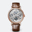Case in 18-carat rose gold with a finely fluted case band. Sapphire case back. 41 mm diameter. Welded lugs with screw bars. Water-resistant to 3 bar (30m). Dial in 18-carat gold, silvered and engine-turned in four different patterns. Individually numbered and signed Breguet. Hours chapter with Roman numerals on a sapphire disc. Breguet open-tipped hands in blued steel. Retrograde dates indication at 12 o'clock, days at 9 o'clock, and months and leap years at 3 o'clock. Small seconds on the tourbillon axis. Manually wound movement with tourbillon and perpetual calendar. Numbered and signed Breguet. Cal. 558QP2. 14 1/2 lines, 21 jewels. Power reserve of 50 hours. Lateral lever escapement and balance with adjustment screws on a Breguet'spring. Frequency 2.5Hz. Adjusted in six positions. Leather strap with a triple-blade folding clasp. Also in platinum.