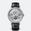 Case in platinum with a finely fluted case band. Sapphire case back. 41 mm diameter. Welded lugs with screw bars. Water-resistant to 3 bar (30m). Dial in 18-carat gold, silvered and engine-turned in four different patterns. Individually numbered and signed Breguet. Hours chapter with Roman numerals on a sapphire disc. Breguet open-tipped hands in blued steel. Retrograde dates indication at 12 o'clock, days at 9 o'clock, and months and leap years at 3 o'clock. Small seconds on the tourbillon axis. Manually wound movement with tourbillon and perpetual calendar. Numbered and signed Breguet. Cal. 558QP2. 14 1/2 lines, 21 jewels. Power reserve of 50 hours. Lateral lever escapement and balance with adjustment screws on a Breguet'spring. Frequency 2.5Hz. Adjusted in six positions. Leather strap with a triple-blade folding clasp. Also in rose gold.