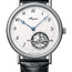 5367PT/29/9WU Breguet The Breguet Classique Tourbillon Extra-Flat 5367PT/29/9WU is a men's luxury watch with a 41mm platinum case. It features a self-winding movement, calibre 581DR, with 16 lines and 42 jewels. The watch also has a tourbillon in a titanium carriage, which helps to improve accuracy by counteracting the effects of gravity. The escapement of the watch is an inverted lateral lever escapement with silicon horns, while the balance spring is made of silicon. The watch has a frequency of 4 Hz and a barrel that is mounted on roller bearings. The peripheral platinum rotor provides an 80-hour power reserve, ensuring that the watch will continue to function even if not worn for a few days. The small seconds display is located on the tourbillon axis, adding to the watch's complexity and sophistication. The ultra-thin 7.45mm case in platinum is complemented by a "Grand Feu" enamel dial with blue-tone hands and Arabic numerals hour marks, which give the watch a classic and timeless appearance. The watch has a sapphire case back that allows the wearer to admire the movement and tourbillon in action. It is water-resistant up to 30 meters or 100 feet, making it suitable for everyday wear but not suitable for water activities such as swimming or diving. The black alligator leather strap with tang buckle completes the look of this elegant and luxurious timepiece.