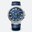 Marine Chronographe in 18-carat white gold with blue dial in gold. Self-winding movement with date and seconds subdial. Minutes and hours counters. Balance spring in silicon. Sapphire caseback. Screw-locked crown. Water-resistant to 10 bar (100m). Diameter: 42.3mm. Available with a leather or rubber strap.