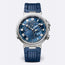 Marine Alarme Musicale in 18-carat white gold with blue dial in gold. Self-winding movement with date. Alarm time and alarm power reserve indicators. Alarm on/off indicators. Second time zone. Balance spring in silicon. Sapphire caseback. Screw-locked crown. Water-resistant to 5 bar (50m). Diameter: 40mm. Available with a leather or rubber strap.