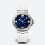 Marine Dame wristwatch in steel. Self-winding movement with date. Balance spring, lever and escape wheel in silicon. Blue handcrafted lacquered dial. Sapphire caseback with oscillating weight decorated with mother-of-pearl, hand-engraved on a rose engine. Water-resistant to 5 bar (50m). Diameter: 33.8mm. Also available with white mother-of-peal dial. Available with leather or rubber strap.