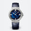 Marine Dame wristwatch in steel. Self-winding movement with date. Balance spring, lever and escape wheel in silicon. Blue handcrafted lacquered dial. Sapphire caseback with oscillating weight decorated with mother-of-pearl, hand-engraved on a rose engine. Water-resistant to 5 bar (50m). Diameter: 33.8mm. Also available with white mother-of-peal dial. Available with leather or rubber strap.