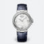 Marine Dame wristwatch in steel. Self-winding movement with date. Balance spring, lever and escape wheel in silicon. Bezel set with 60 diamonds, approx. 0.846ct, and natural mother-of-pearl dial. Sapphire caseback with oscillating weight decorated with mother-of-pearl, hand-engraved on a rose engine, ''marea'' motif. Water-resistant to 5 bar (50m). Diameter: 33.8mm. Also available with blue handcrafted lacquered dial. Available with leather or rubber strap.