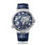 5557BB/YS/9WV Breguet The Breguet Marine Hora Mundi 5557BB/YS/9WV is a luxurious men's watch with a 43.9mm case made of 18K white gold and a stylish alligator leather strap. The dial is made with a gold base and features a blue background of engine-turned waves that represent the ocean. The continents are outlined with a metallic turquoise border, and a sapphire plate with metalized meridians covers the continents. The Roman numerals on the dial are treated with luminescent material, and the blue chapter ring with nautical pennants and dots also features luminescent elements. The watch has a pleasing symmetry, with a rectangular date window at noon and a larger arched city window at 6 o’clock. At 4 o'clock, there is a day/night indicator with a hand-hammered rose gold sun and rhodium-plated moon. The watch also features a sapphire crystal porthole on the case back, which allows the wearer to see the watch's in-house caliber 77F1 movement. This is an automatic movement powered by a nautical wheel-shaped rotor with patented modules for the instant jump dual time display and the programmable mechanical memory wheel. The balance wheel beats at a frequency of 4Hz/28,800vph, and the escapement is made of silicon to protect it from corrosion and magnetism. The Breguet Marine Hora Mundi 5557BB/YS/9WV is water-resistant to 10 bar (100m), making it suitable for swimming, snorkeling, and light recreational diving. This luxurious timepiece is a beautiful and functional accessory for any gentleman who appreciates fine watchmaking and nautical design elements, with the added touch of a stylish alligator leather strap.