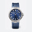 Marine wristwatch in in titanium with sunburst blue dial in gold. Self-winding movement with date. Balance spring in silicon. Sapphire caseback. Screw-locked crown. Water-resistant to 10 bar (100m). Diameter: 40mm. Available with leather or rubber strap or titanium bracelet.