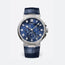 Marine Chronograph in titanium with sunburst blue dial in gold. Self-winding movement with date and seconds subdial. Minutes and hours counters. Balance spring in silicon. Sapphire caseback. Screw-locked crown. Water-resistant to 10 bar (100m). Diameter: 42.3mm. Available with leather or rubber strap or titanium bracelet.