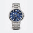 Marine Chronograph in titanium with sunburst blue dial in gold. Self-winding movement with date and seconds subdial. Minutes and hours counters. Balance spring in silicon. Sapphire caseback. Screw-locked crown. Water-resistant to 10 bar (100m). Diameter: 42.3mm. Available with leather or rubber strap or titanium bracelet.
