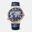Marine Hora Mundi wristwatch in 18-carat rose gold. Self-winding movement. Dual preset time zones with instant-jump and synchronised date, day/night and city displays. Blue dial in gold, hand-engraved on a rose engine, with sapphire metallization. Luminescent hands and hour-markers. Sapphire caseback. Screw-locked crown. Water-resistant to 10 bar (100m). Diameter: 43.9mm. Available with leather strap, rubber strap or rose gold bracelet.