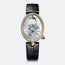 Reine de Naples wristwatch in 18-carat yellow gold. Bezel and dial flange set with 128 diamonds weighing approx. 0.83 ct. Self-winding movement with running seconds. Power-reserve and moon-phase indicators. Silvered gold dial, hand-engraved on a rose engine and partly in white natural mother-of-pearl. Sapphire caseback. Water-resistant to 3 bar ( 30 m ). Dimensions : 36.50 x 28.45 mm. Also in white gold. Available with gold bracelet.