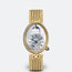 Reine de Naples wristwatch in 18-carat yellow gold. Bezel and dial flange set with 128 diamonds weighing approx. 0.83 ct. Self-winding movement with running seconds. Power-reserve and moon-phase indicators. Silvered gold dial, hand-engraved on a rose engine and partly in white natural mother-of-pearl. Sapphire caseback. Water-resistant to 3 bar ( 30 m ). Dimensions : 36.50 x 28.45 mm. Also in white gold.