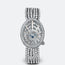 Reine de Naples wristwatch in 18-carat white gold. Bezel and caseband set with 76 baguette-cut diamonds, approx. 6.06 cts. Self-winding movement. Chapter ring paved with 42 baguette-cut diamonds, approx. 2.77 cts, and hour markers in natural mother-of-pearl. Silvered gold dial, hand-engraved on a rose engine. Pear-cut diamond, approx. 0.09 ct, at 6 o'clock. Bracelet paved with 320 diamonds, approx. 14.05 cts. Sapphire caseback. Dimensions : 38.50 x 30.45 mm. Available with satin or pink Akoya pearls bracelet.