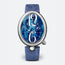 Reine de Naples wristwatch in steel. Self-winding movement. Balance spring and escapement in silicon. Blue dial with Breguet Arabic numerals. Sapphire caseback. Water-resistant to 3 bar ( 30 m ). Dimensions : 43.75 x 35.50 mm. Also available with white or blue natural mother-of-pearl dial.