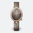 Case in 18-carat rose gold, cambered ovoid with a delicately fluted case band. Crown set with a briolette diamond (approx. 0.15 ct). Attachment set with 16 brilliant-cut diamonds (approx. 0.08 ct). Sapphire-crystal case back. Dimensions 32.7 x 27.3mm. Water resistant to 3 bar (30m). Dial in Tahitian mother-of-pearl. Off-centre chapter ring at 6 o'clock with Roman numerals in Tahitian mother-of-pearl marquetry. Self-winding movement.