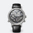 Tradition independent chronograph in 18-carat white gold. Anthracite hand-wound movement. 20-minute counter and power reserve indicator also on the back of the movement. Chronograph running indicator at 6 o?clock. Silicon Breguet balance-springs. Off-centred dial in silvered gold, hand engraved on a rose engine. Sapphire crystal caseback. Water-resistant to 3 bar (30 m). Diameter: 44 mm. Also available in rose gold.