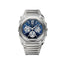 dial with translucent lacquer and "azuré" silver counters, rhodium plated hands, and applied indexes with superluminova SLN, Satin-polished steel bracelet with 3 blades folding buckle. Mechanical in house ultra-thin movement BVL 318 Finissimo caliber with automatic winding (peripheral rotor), chronograph, small seconds and second time zone functions. Thickness 3.30 mm, Frequency 28'800 VpH (4Hz) Jewels 37. Diameter 37,20. Water-resistant up to 100 metres, 55 hours of power reserve.