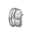 Merging two of the most iconic symbols of Bvlgari design, the Serpenti Tubogas watch coils the sinuosity of the snake with the contemporary soul of tubogas. Evoking both the sensual curves of a woman and the fluid shape of the serpent, the timepiece is crafted with the shapely lines of this specific technique, with a flexible and tubular litheness. Radiating glamour and a truly individual style, this watch marks a distinctive chapter in the constant evolution of Serpenti. Serpenti Tubogas watch with quartz movement, 35 mm stainless steel curved case set with brilliant cut diamonds, stainless steel crown set with a cabochon cut pink rubellite, silver opaline dial with guilloché soleil treatment and hand-applied indexes, single spiral stainless steel bracelet.