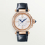 WJPA0027 Cartier  This watch comes with 35 mm 18K Rose Gold case. The 18K Rose Gold fixed bezel is secured with set with 48 diamonds totaling 1.15 carats. Fluted crown cap and crown set with sapphires. Silvered engraved dial set with 12 brilliant-cut diamonds totaling 0.03 carats. Gold Arabic numerals appear at the 3 , 6 , 9 and 12 o'clock positions. Minute marks in the inner ring. Blued-steel sword-shaped hands. Central second hand. The watch performs following functions: hours, minutes, seconds. Self-winding mechanical movement Case Thickness - 9.4 mm. Case back is transparent. Sapphire crystal protects front and  back side of the watch. Alligator leather strap with folding buckle. This model is water-resistant up to 100 m.