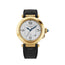 This Pasha de Cartier is crafted in a 41mm 18k yellow gold case and styled on a black leather strap. The round gold case holds a silvered dial with a refining square design that hosts basic timekeeping capabilities, as well as a date window between 4 and 5 o'clock. Distinct blue hands and a sapphire crown cap are signatures of the brand.