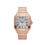 Santos de Cartier, large model with automatic mechanical movement, caliber 1847 MC. The case and 7-sided crown are crafted from rose gold, with the crown set with a faceted sapphire. The watch features a silvered opaline dial, blued-steel sword-shaped hands, and a sapphire crystal. It comes with a rose gold bracelet equipped with the "SmartLink" adjustment system, and an additional alligator skin bracelet with an interchangeable rose gold folding buckle.