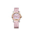 278573-6011 Chopard. The Chopard Happy Sport 278573-6011 watch features a 30mm stainless steel case with a fixed 18K rose gold bezel. The pink-toned textured mother-of-pearl dial has rose gold-tone hour markers, which are complemented by leaf-shaped hands and Roman numeral hour markers. The dial also features five dancing diamonds, adding a touch of elegance to the watch. The watch performs basic timekeeping functions such as hours, minutes, and seconds, and is powered by a self-winding mechanical movement containing 27 jewels with a power reserve of approximately 42 hours. The scratch-resistant sapphire crystal adds durability to the watch, and the case back is transparent, providing visibility of its inner workings. The watch has a case thickness of 11.23mm and is paired with a pink alligator leather strap with a matte finish and a steel pin clasp buckle, which is both comfortable and stylish. The watch is also water-resistant up to 30 meters or 3 ATM, making it suitable for daily wear. Overall, the Chopard Happy Sport 278573-6011 is a beautifully designed watch that showcases elegant features such as the dancing diamonds and the leaf-shaped hands index. The combination of stainless steel and 18K rose gold adds sophistication to the watch, while the pink alligator leather strap creates a striking and stylish look.
