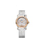278573-6018 Chopard. The Chopard Happy Sport 278573-6018 watch features a 30mm stainless steel case with a fixed 18K rose gold bezel. The silver-tone textured mother-of-pearl dial has rose gold-tone hour markers, which are complemented by leaf-shaped hands and Roman numeral hour markers. The dial also features five dancing diamonds, adding a touch of elegance to the watch. The watch performs basic timekeeping functions such as hours, minutes, and seconds, and is powered by a self-winding mechanical movement containing 27 jewels with a power reserve of approximately 42 hours. The scratch-resistant sapphire crystal adds durability to the watch, and the case back is transparent, providing visibility of its inner workings. The watch has a case thickness of 11.23mm and is paired with a white alligator leather strap with a matte finish and a steel pin clasp buckle, which is both comfortable and stylish. The watch is also water-resistant up to 30 meters or 3 ATM, making it suitable for daily wear. Overall, the Chopard Happy Sport 278573-6018 is a beautiful and sophisticated watch that combines classic elegance with modern design elements, adding a touch of luxury to any outfit.