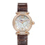 384319-5010 Chopard. The Chopard Imperiale Ethical 384319-5010 is a beautiful and elegant women's watch with a 29 mm 18K rose gold case and a fixed bezel set with diamonds. The mother-of-pearl dial is adorned with alternating diamond hour markers and rose gold hour markers at the Roman numerals 12 and 6 positions. The minute track in the center of the dial is varnished on mother-of-pearl, and the rose gold dagger-shaped hands have luminous filling, making it easy to read the time in any lighting condition. The Chopard logo is located under the 12 o'clock position, and the crown is adorned with a single amethyst cabochon. This watch is an analog watch that performs the basic functions of hours, minutes, and seconds. It is powered by a self-winding mechanical movement, specifically the Calibre 09.01-C, which has 27 jewels and provides reliable timekeeping. The watch also features a glareproof scratch-resistant sapphire crystal, ensuring its durability and longevity. The case back is transparent, allowing for a view of the watch's intricate movements, and the power reserve is approximately 42 hours. The brown alligator leather strap adds a touch of sophistication to the watch and is secured with a stainless steel tang buckle. The watch is also water-resistant up to 50 meters, making it suitable for everyday wear and light water activities. Overall, the Chopard Imperiale Ethical 384319-5010 is a stunning watch that combines luxury with ethical values, making it a perfect choice for any woman who wants to make a statement while also supporting sustainable practices in the luxury watch industry.