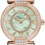 384242-5022 Chopard. The Chopard Imperiale Joaillerie Ethical 384242-5022 is a stunning timepiece featuring a 36 mm Ethical 18K Rose gold case with a fixed ethical 18-K Rose gold & Diamonds bezel. The green mother of pearl dial contains diamonds and Rose gold-tone hands, with applied index hour markers encrusted with diamonds and applied Roman numerals appearing at the 3, 6, 9 and 12 o'clock positions. The Chopard logo is located under 12 o'clock. The total weight of the gems is 2.93 carats, adding a luxurious touch to the timepiece. With a self-winding mechanical movement containing 25 Jewels and beating at 28,800 vph, the watch performs basic timekeeping functions such as hours and minutes. The scratch-resistant sapphire crystal ensures durability, and the case back is solid to protect the watch's inner workings. It has a power reserve of approximately 42 hours. The green alligator leather strap comes with an ethical 18K Rose gold tang buckle, providing both comfort and style. Lastly, the watch is water-resistant up to 50 meters, allowing it to be worn during everyday activities.