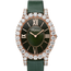 139383-5009 Chopard. The Chopard L'Heure Du Diamant Oval 139383-5009 is a luxury women's watch that features a 40.00 mm x 34.10 mm ethical 18-K Rose gold case with a fixed ethical 18-K Rose gold & Diamonds bezel. The bezel and lugs are adorned with 42 prong-set brilliant cut diamonds weighing a total of approximately 6.94 carats, while the crown is set with 1 briolette diamond weighing approximately 0.04 carats. The watch's green lacquered dial features a guilloche center, with rose gold index hour markers and Roman numerals appearing at the 3, 6, 9, and 12 o'clock positions. The Chopard logo can be found under the 12 o'clock position. The watch performs the functions of hours and minutes, with a quartz movement that contains 7 jewels. The watch's case back is solid and it features a scratch-resistant sapphire crystal. The watch comes with a green leather strap and an 18-K Rose gold & Diamonds tang buckle. The Chopard L'Heure Du Diamant Oval 139383-5009 is water-resistant up to 30 meters (100 feet), making it suitable for light water activities such as swimming or snorkeling, but not suitable for diving. Overall, the watch is a high-end luxury timepiece that combines elegant design with exceptional mechanical performance. The watch's use of diamonds and other high-end materials make it a truly luxurious accessory for any occasion.