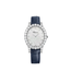 139383-1223 Chopard This Watch comes with 40 x 34 mm 18k white gold case set with diamonds. Fixed 18k white gold bezel set with diamonds. Textured mother-of-pearl dial. Diamond hour markers. White gold leaf-shaped hour hands. The total weight of the gems is 7.13 carats. The watch performs following functions: hours, minutes. Hand-wound mechanical movement. 18 Jewels. Power reserve approximately 42 hours. Case Thickness - 8.6 mm. Case back is solid. Sapphire crystal protects front side of the watch. Blue alligator leather strap with pin buckle. This model is water-resistant up to 30 m.