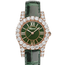 13A377-5008 Chopard. The Chopard L’Heure Du Diamant Round Small 13A377-5008 is a luxurious and elegant women's watch. It features a 30 mm case made of ethical 18-K rose gold, which is fixed with a bezel that is also made of ethical 18-K rose gold and decorated with 38 prong-set brilliant cut diamonds weighing a total of approximately 5.38 carats. The crown is also set with a briolette diamond weighing approximately 0.04 carats. The watch has a green lacquered dial with a guilloché center, featuring rose gold index hour markers and Roman numerals at the 3, 6, 9, and 12 o’clock positions. The Chopard logo is located just below the 12 o'clock position. The watch is powered by a self-winding mechanical movement, the Chopard calibre 09.01-C, which contains 27 jewels and has a power reserve of approximately 42 hours. The movement can be seen through the transparent case back. The watch is equipped with scratch-resistant sapphire crystal, ensuring durability and longevity. It comes with a green alligator leather strap with an ethical 18-K rose gold and diamonds tang buckle, providing a comfortable and secure fit. The watch is water-resistant up to 30 meters or 100 feet, making it suitable for occasional water exposure, but not suitable for swimming or diving. Overall, the Chopard L’Heure Du Diamant Round Small 13A377-5008 is a luxurious and stylish timepiece that combines high-quality materials, precise movement, and elegant design.