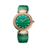 Framing the intensity of a natural gemstone dial with the delicacy of the collection’s iconic fan-shaped motif, this Divas' Dream timepiece blends Bvlgari’s passion for color with refined and graceful design. Capturing the vivid shades and the sensual curves of Rome’s ancient mosaics at the Baths of Caracalla, the Divas' Dream watch pays homage to the most glamorous divas and charismatic women, with unmistakable Roman spirit. Divas' Dream watch with quartz movement, 30 mm 18 kt rose gold case, 18 kt rose gold bezel and fan-shaped links both set with brilliant-cut diamonds, 18 kt rose gold crown set with a cabochon-cut rubellite, malachite dial, diamond indexes, green alligator strap and 18 kt rose gold pin buckle.