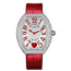 Heart Case. 18k White Gold. Hand polished. Hand set with 180 brilliant-cut diamonds (3.28 carats). Rhodium plating. Water resistant up to 30 meters. Width: 34.5 mm x Length: 39.8 mm x Thickness: 7.8 mm. Sapphire crystal Hours, Minutes Crown with 2 positions: 1. On. 2. Time Setting MVT FM 2750-QZ. Quartz movement. Battery life of 3 years. 5 Rubies. Diameter: 17.50 mm. Thickness 2.75 mm. Quartz frequency at 32'768 Hz Cotes de Geneve and sunray brushing on the casing ring Hand sewn alligator strap 18k White Gold buckle. Hand set with 6 brilliant-cut diamonds (0.10 carats). Hand polished. Rhodium plating Stamped guilloche with sun pattern. 20 Layers of translucent lacquer. Red Heart at 6 o'clock