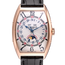 Preowned-6850 MC L Franck Muller This watch has a 47 x 34 mm 18K Rose Gold case. Fixed 18K Rose Gold bezel. Silver guilloche dial with black Arabic numerals. Blue hour hands. Minute markers around an inner ring. Central second hand. Date display on the inner ring. Moon phase is located at 6 o’clock position. Day of the week and month windows are located at the 12 o'clock position. The watch performs following functions: perpetual calendar, month, day of the week, date, hours, minutes, seconds, moon phase. Self-winding mechanical movement is powered by a ?alibre 2800. Power reserve approximately 42 hours. Case back is solid. Sapphire crystal protects front side of the watch. Alligator leather strap strap with pin clasp buckle. This model is water-resistant up to 30 m.