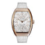 Vanguard Case. 18k Rose Gold. Hand polished. Water resistant up to 30 meters. Width: 32 mm x Length: 42.3 mm x Thickness: 9.9 mm. White inserts on both sides of the case. Sapphire crystal Hours, Minutes Winding shaft with 2 positions: 1.Marche. 2.Time setting MVT FM 1518-QZ. Quartz movement. Battery life of about 5 years. 40 Components. 5 Jewels. Width: 9.00 mm. Length: 15.55 mm. Thickness: 1.80 mm. Quartz frequency set at 32,768 alternations per hour Cotes de Geneve and circular graining on the casing ring. 24k Gold finish on the written engravings and rhodium plating Hand sewn alligator strap 18k Rose Gold buckle. Hand polished Stamped guilloche with sun pattern. 20 Layers of translucent lacquer. Applique numerals meticulously painted and applied by hand