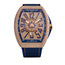 Vanguard Case. 18k Rose Gold. Hand polished. Water resistant up to 30 meters. Width: 41 mm x Length: 49.95 mm x Thickness: 12.2 mm. Blue inserts on both sides of the case. Sapphire crystal Hours, Minutes, Seconds, Date at 6 o'clock Winding shaft with 3 positions: 1.Winding. 2.Date setting 3.Time setting MVT FM 800-DT. Self-winding movement with bidirectional rotor system. Power reserve of 42 hours. 165 Components. 21 Jewels. Diameter: 25.60 mm. Thickness: 3.75 mm. Balance wheel frequency set at 28,800 alternations per hour Cotes de Geneve and brushing soleil papier on the bridges and the rotor. Circular graining on the two sides of the main plate . Chamfering of the bridges. 24k Gold bath and rhodium plating of the components. 24k Gold finish on the written engravings. Circular brushing of the rotor ball bearing. Brushing soleil papier on the barrel Polishing at 45 degrees and brushin