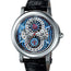 Preowned - AQG.Y.87.129.CM.BD Gerald Genta The Gerald Genta Arena Perpetual Calendar GMT AQG.Y.87.129.CM.BD is a remarkable timepiece that showcases a fusion of intricate design, functionality, and exceptional craftsmanship. The watch features a substantial 45 mm case made of titanium and platinum, offering durability and a contemporary aesthetic. The fixed bezel enhances the overall design and complements the case material. The dial exhibits a captivating blue/silvery color combination, providing an attractive backdrop for the black inner bezel with minute markers. The Arabic numerals add a distinctive touch to the dial, enhancing its legibility. The skeletonized hour hands and the red central second hand contribute to the watch's visual appeal. The watch offers a range of functions, including hours, minutes, seconds, GMT, and perpetual calendar. The sub-dials for date, day of the week, month, and GMT display are strategically placed, providing practical information at a glance. Powering the watch is a self-winding mechanical movement, the Calibre GG 7044, which ensures precise timekeeping and a power reserve of approximately 45 hours. The case back is solid, protecting the internal components and providing a sleek finish to the watch. Sapphire crystal on the front side ensures scratch resistance and offers clear visibility of the dial. The black alligator leather strap with a folding clasp ensures a secure and comfortable fit on the wrist, completing the luxurious appeal of the timepiece. With a water resistance of up to 100 meters, this model offers practicality for everyday wear, making it a versatile choice for various occasions. In summary, the Gerald Genta Arena Perpetual Calendar GMT AQG.Y.87.129.CM.BD is an exceptional watch that seamlessly combines aesthetic beauty with functional complexity, appealing to watch enthusiasts seeking both style and substance.