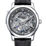 Grey skeleton dial. White Arabic numerals and hour markers. Arabic numerals appear at the 3, 6, 9 and 12 o’clock positions. White skeleton hour hands. 15-day power reserve indicator at 8 o'clock, torque indicator at 4 o'clock.