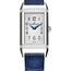 Q3288420 Jaeger Lecoultre The Jaeger-Lecoultre Reverso Classic Monoface Q3288420 is a stunning timepiece that embodies the iconic design and craftsmanship of the Reverso collection, combined with elegant diamond detailing. The watch features a stainless steel case with dimensions of 40.1 x 20 mm, maintaining the classic rectangular shape that defines the Reverso series. The stainless steel fixed bezel is adorned with 26 diamonds, totaling approximately 0.29 carats. This diamond embellishment adds a touch of luxury and sophistication to the watch's appearance. The dial of the watch is a silvered grey sunburst guilloché pattern, which creates a dynamic play of light and shadows across the surface. This textured dial enhances the visual appeal of the timepiece and adds depth to its design. The blue sword-shaped hour hands and black transferred Arabic numerals provide a captivating contrast against the silvery backdrop, ensuring legibility and elegance. The watch offers the essential functions of hours and minutes, providing a straightforward and reliable timekeeping experience. Powering the watch is a quartz movement, Calibre 656, known for its accuracy and low-maintenance nature. The movement offers a remarkable power reserve of approximately 43,200 hours, minimizing the need for frequent battery changes. With a case thickness of 7.9 mm, the watch strikes a balance between elegance and comfort, making it suitable for a variety of occasions. The solid case back provides a sleek surface for potential engravings or personalizations, while the sapphire crystal on the front side protects the dial from scratches and minor impacts. The watch comes with a blue alligator leather strap fitted with a folding clasp buckle. This strap not only complements the watch's design but also ensures a comfortable and secure fit on the wrist. With a water resistance of up to 30 meters, the watch is suitable for everyday wear and can withstand minor exposure to water, such as splashes or rain. In summary, the Jaeger-Lecoultre Reverso Classic Monoface Q3288420 is a harmonious blend of timeless design, diamond embellishments, and modern functionality. Its refined aesthetics, including the sunburst guilloché dial and diamond-set bezel, make it an exquisite accessory for those who appreciate both luxury and understated elegance.