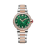 Lvcea watch with automatic movement, hours, minutes and seconds functions, 33 mm polished stainless steel case, 18 kt rose gold bezel set with round brilliant-cut diamonds, green malachite marquetry dial, 12 round brilliant-cut diamond indexes and cabochon-cut synthetic pink sapphire crown set with a diamond. Bracelet in 18 kt rose gold and polished, satin-brushed stainless steel with folding buckle. Water-resistant up to 50 meters.